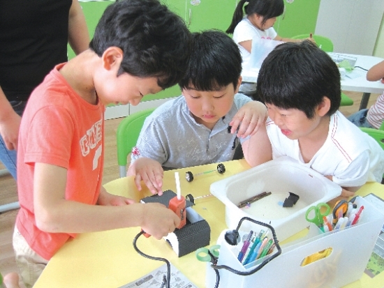 군산 당북초등학교가 운영하는 BMW 코리아 미래재단의 기업 교부를 활용한 창의인재 융합교육 프로그램'주니어 캠퍼스'에 참여한 학생들이 자동차 모형을 만들고 있다. 이 프로그램을 통해 학생들은 자동차 속 과학원리를 친환경적인 과학 기술·지속 가능한 에너지원과 연계해 재미있게 과학을 이해할 수 있다.