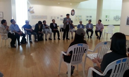 ▲ 지난 26일 한국소리문화의전당에서 열린'추억의 만화경展' 개막식에서 원로 만화작가들이 관객과 대화를 하고 있다.