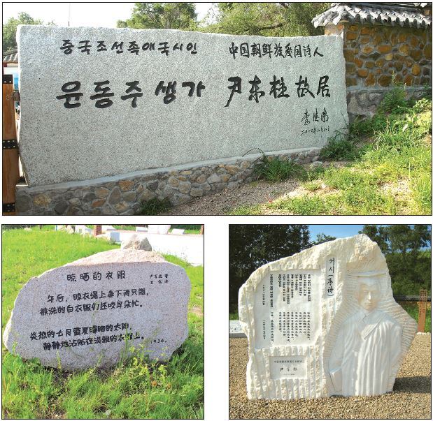 생가 입구에는 엄청난 크기의 석조 간판이 세워져 '중국 조선족 애국시인 윤동주 생가'라는 중국인 글씨의 한글과 한자가 병기돼 있는가 하면, 마당에 설치된 수십개의 시 조형물들은 한자로 번역해 새겨진 시비(詩碑)로 난립돼 있는 상황이다.