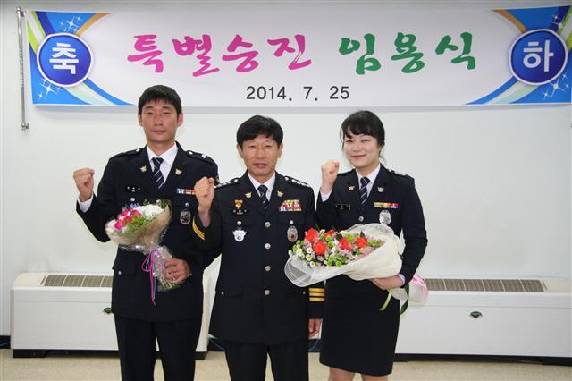 ▲ 익산경찰서 김찬순 경사(왼쪽)와 중앙지구대 송윤아 순경(오른쪽)이 각각 일계급 특별 승진을 해 강황수 서장과 기념촬영을 하고 있다.