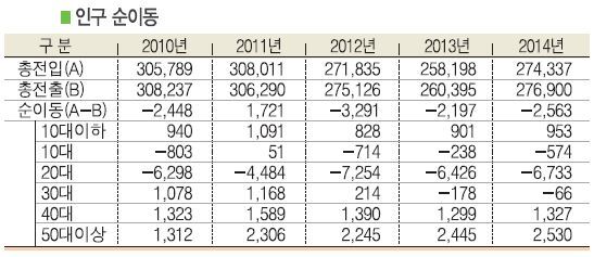 연령별 순이동(-2563명)은 20대(6733명)와 10대(574명), 30대(66명) 등에서 순유출(총 7373명)이 두드러졌다.