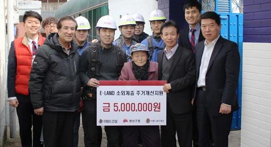 이랜드복지재단은 이랜드건설과 함께 지난 15일부터 19일까지 5일간 전주시 완산구 관내 저소득층 어르신 2가구의 주거환경을 개선하는 이랜 드림 하우스 사업으로 아름다운 희망을 선물했다.
