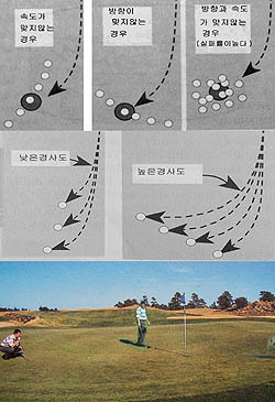 제일먼저 우리가 생각해야 할 것은 그린의 속도 즉 빠르기(speed) 이다. 그린의 빠르기를 완벽하게 파악하지 못하면 그림과 같이 짧거나 홀(hole)을 그냥 지나 칠 수가 있지 때문이다. 또한 우리가 살펴야할 것은 그린의 경사도(slope) 이다. 그린의 빠르기가 정확하더라도 그린의 경사를 제대로 읽지 못한다면 이 또한 성공할 수가 없다.
