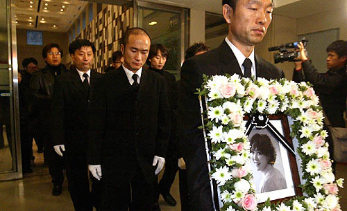 암으로 숨진 가수 길은정씨의 영결식이 열린 9일 아침 강남 삼성서울병원에서 유족들이 故 길은정씨의 영정을 옮기고 있다. (desk@jjan.kr)
