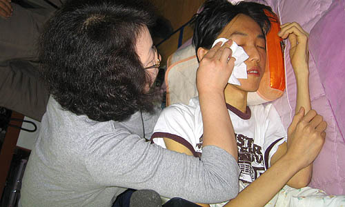 전역 20여일 만에 간암 말기 판정을 받고 투병 중인 윤여주씨를 어머니가 돌보고 있다. (desk@jjan.kr)