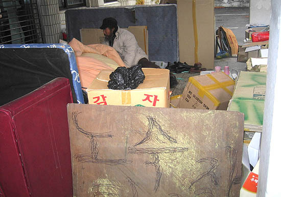 오전 10시, 새벽까지 있던 리어카 두 대 중 한대가 안 보인다. 숙소에 가보니 노숙자 한 명이 박스에 등을 기댄 채 우두커니 앉아있다.