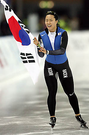 21일 새벽 (한국시간) 이탈리아 토리노 오발 링고트 빙상경기장에서 열린 스피드 스케이팅 여자 500m 경기에서 이상화가 중국의 우징을 제치고 우승한 뒤 태극기를 들고 트랙을 돌고 있다.../연합뉴스 (desk@jjan.kr)