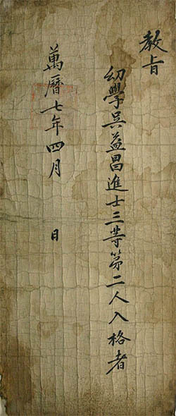 오익창이 1579년의 진사시에 응시하여 받은 합격증서[백패] (desk@jjan.kr)