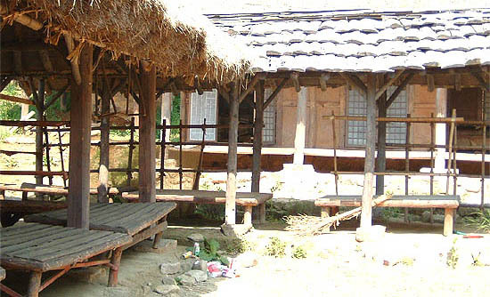 세트장 위쪽에 위치한 장터의 문짝은 관람객의 손길을 이기지 못해 떨어져 나가 건물 몸체에 기대고 있다.
