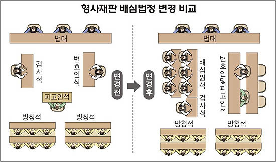 전주지법 관계자는 “국민참여재판제가 도입되면 국내에서도 외국영화에서처럼 구술심리로 진실을 가리는 법정공방이 본격화될 것”이라며 “내년부터 5년간 배심·참심혼합형 국민참여재판제도를 도입한 뒤 미비점을 보완해 2012년부터 본격적 시행할 예정”이라고 말했다.
