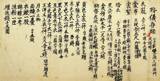 그렇지만 옛 사람들에게 있어서도 혼인은 장례만큼은 아닐지라도 ‘돈’걱정을 하지 않을 수 없었다. 왕씨 성을 가진 지방의 한 양반이 둘째 아들 재섭을 산동 대평에 살던 홍씨 가문의 딸과 결혼하면서 작성한 문서를 보면, 지방의 양반이 아들 혼례를 위해 무엇을 준비하고 있었고, 얼마만큼의 돈이 들어가는지를 알 수 있다.