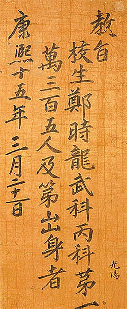 다산 정약용은 그의 저서 목민심서에서 조선 후기에 무과시험이 극도로 부패하게 된 주요 원인으로 다섯가지를 지적하여 이를 5난(亂)으로 부르고 있다. 오늘 소개하고자 하는 만과(萬科)도 그 중 하나이다. 만과는 글자 그대로 만명이나 되는 많은 급제자를 뽑았던 데서 붙여진 이름이다. 물론 무과에만 해당하는 이야기이다. 그림에 보이는 무과 합격증서 즉 무과 홍패의 주인공 정시룡은 숙종 2년(1676)의 무과에 응시하여 병과 10,305인의 성적으로 급제하였는데, 이 때 선발된 인원은 자그마치 18,251명이나 되었다. 병진만과(丙辰萬科)로 불리는 이 시험은 조선조에서 가장 많은 급제자를 배출한 과거였다. 이렇게 많은 인원을 선발하다 보니 그 시험이 제대로 실시될 리가 만무하였다.