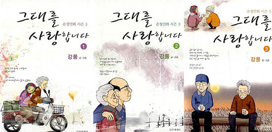 포털 사이트 ‘다음’에 5개월간 연재되어 총 페이지뷰 2천5백만 회에 댓글 수 6만의 폭발적인 반응을 불렀던 강풀(본명 강도영)의 연재만화 <그대를 사랑합니다> (문학세계사 간, 전3권>가 책으로 출간되었다. 폐지 줍는 할머니와 우유 배달하는 할아버지의 사랑 이야기를 축으로 주차장 관리 할아버지 부부 등의 사연이 치밀하게 얽혀 극적인 전개와 반전의 재미가 대단하다. 그대를>