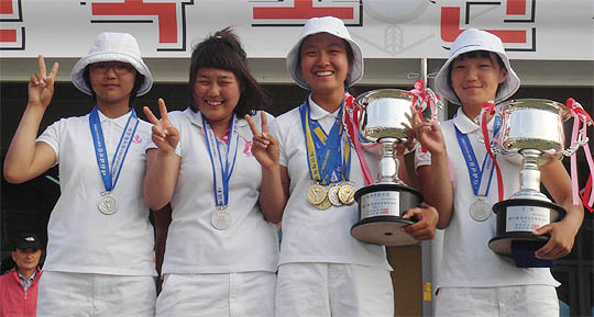 제37회 전국소년체전에서 금 3, 은 3, 동 1 등 총 7개 메달을 따낸 도내 양궁 여자중등부 선수들.왼쪽부터 김현숙 백안나 이진영 진솔. (desk@jjan.kr)