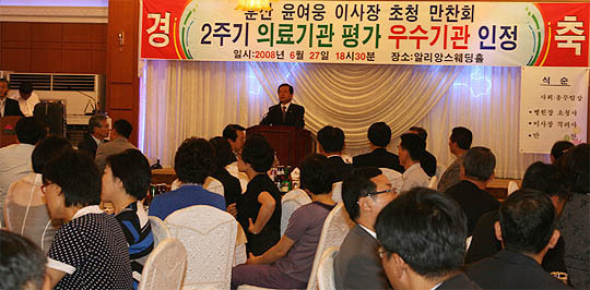 보건복지가족부주관 전국종합병원 서비스평가에서 원광대병원의 우수기관 선정을 축하 격려하기 위해 임정식 병원장을 비롯한 정은택 진료처장,노동열 행정처장 등 보직교수및 중간 간부 200여명을 초청한 이날 만찬에서 윤 이사장은 "최고의 병원을 만들어 가려면 구성원들의 노고와 성과에 다시한번 깊은 감사를 드린다"면서 환자들의 위한 전직원의 주인의식 필요성을 강조했다.