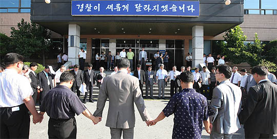 26일 한국기독교장로회 전북노회·전북동노회·익산노회·군산노회원들이 전주 예벗교회당에서 한상렬 목사 석방을 위한 비상 시국기도회를 마치고 전주완산경찰서로 이동해 항의서한을 전달한 뒤 기도를 하고 있다.