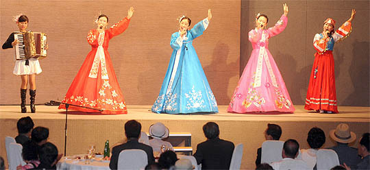 8.15계기 이산가족 초청행사가 27일 전주 월드컵컨벤션센터에서 열린 가운데 탈북자로 구성된 평양통일예술단들이 공연을 펼치고 있다.