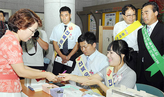 전주시가 1일 시청로비에서 마련한 재래시장 상품권 사주기 행사에서 시청 직원들이 상품권을 구매하고 있다.