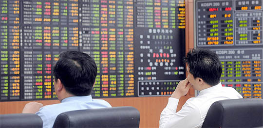 환율상승과 주가폭락이 이틀째 이어지면서 금융시장의 불안이 지속되고 있는 가운데, 2일 전주 한국투자증권의 객장에서 고객들이 답답한듯 시황판을 바라보고 있다.