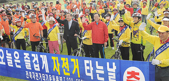 2일 전주시청 노송광장에서 열린 자전거타기 활성화 선포식 및 자전거 대행진에서 참가자들이 파이팅을 하고 있다.