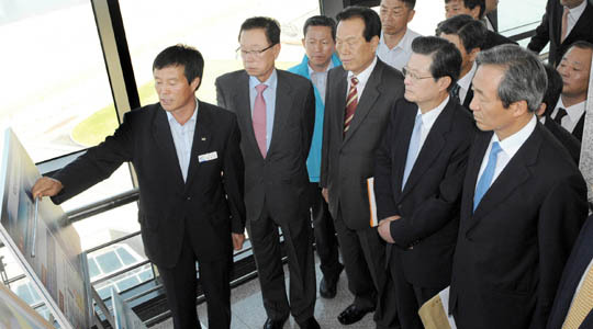한나라당 박희태 대표와 최고위원들이 전북도와 정책협의회를 마친 뒤 군산 신시도 전망대에서 김성기 새만금 사업단장으로부터 새만금 활용방안에 대해 설명을 듣고 있다.