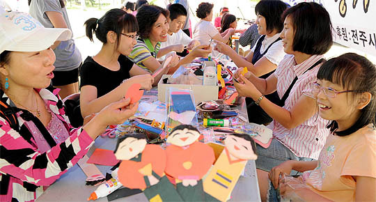 2008년 전주시 학습동아리 활성화 지원사업으로 실시된 찾아가는 한지공예체험 행사가 7일 전주 덕진공원에서 열린 가운데 참가자들이 한지를 이용한 책꽃이를 만들고 있다.