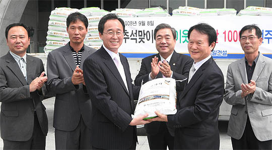 8일 전주시청앞 광장에서 제일건설이 추석맞이 불우이웃돕기 쌀 1000포를 전주시에 전달하고 있다.