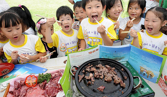 광우병 청정지대 만들기 선포식 및 먹거리 마당이 8일 전주시청 노송광장에서 열린 가운데 전주시보육시설연합회에서 만든 부스에서 유치원생들이 한우고기를 시식하고 있다.