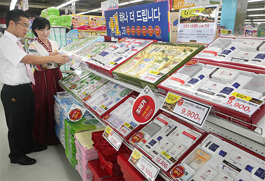 경기침체가 장기화 되면서 추석선물로 저가선물세트를 찾는 고객들이 늘어나자 유통업계도 1만원대 실속형 선물세트를 대거 준비했다. 9일 전주의 한 대형마트에서 고객들이 선물을 고르고 있다.