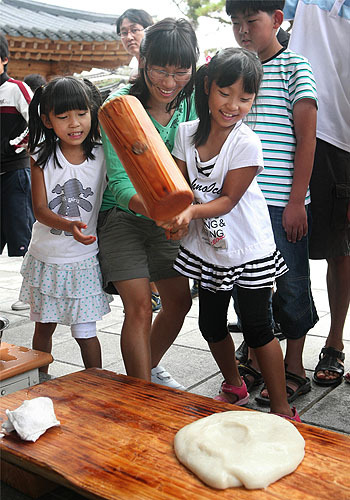 추석 연휴 마지막날인 15일 전주 한방문화센터를 찾은 어린이들이 엄마와 함께 떡메치기 체험을 하며 즐거운 시간을 보내고 있다.