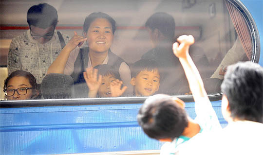추석 연휴 마지막날인 15일 전주역에서 한 가족이 헤어짐이 아쉬운 듯 인사를 나누고 있다.