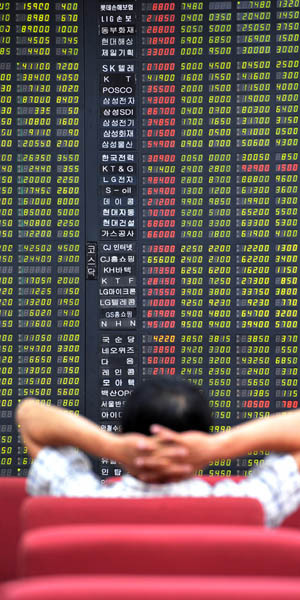 리먼브러더스의 파산 보호 신청 등 미국발 악재로 주가가 폭락하며 유가증권 시장에 사이드카가 발동된 가운데 16일 전주 한 증권사 객장에서 투자자가 걱정스런 모습으로 시세판을 지켜보고 있다.