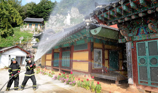17일 전주 완산소방서 교동 119안전센터 소방대원들이 동고사절에서 목조문화재 화재 안전대비 합동훈련을 하고 있다.