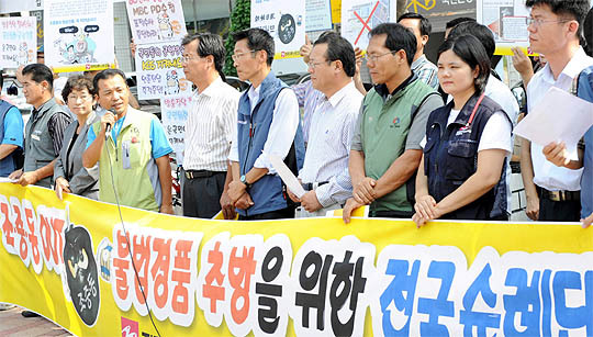 17일 전주 오거리문화광장에서 전국언론노동조합의 조중동 OUT·불법경품 추방을 위한 전국순례단 회원들이 불법·탈법으로 무가지·경품 등을 제공하며 구독률 높이기에 여념이 없는 조중동을 절독해야 한다는 기자회견을 하고 있다.
