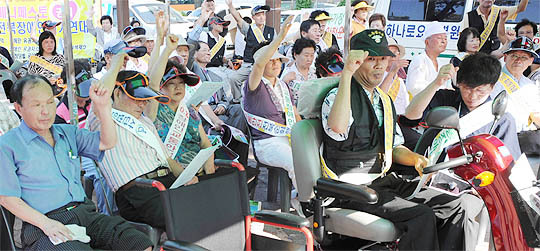18일 전주 오거리 광장에서 열린 장애인 교통안전 전국순례 캠페인에서 참석자들이 교통예방 구호를 외치고 있다.