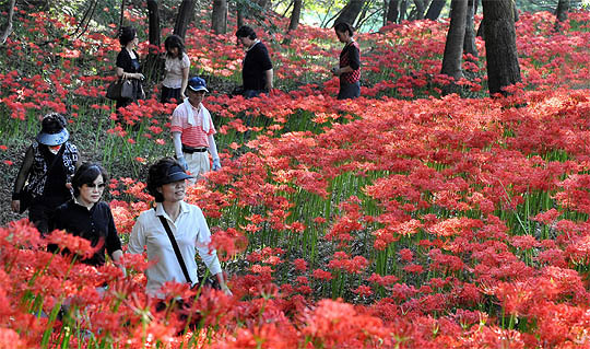 꽃과 잎이 따로피는 까닭에 상사화로도 불리는 꽃무릇이 21일 고창 선운사에 무리를 지어 곱게 핀길을 관광객들이 걷고 있다.