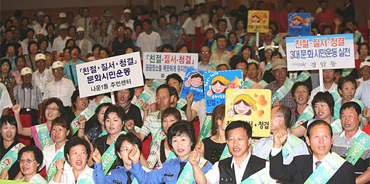 지난 22일 오후 군산대 아카데미홀에서 '친절·청결·질서'3대 문화시민운동 실천 다짐대회에 참석한 시민들이 살고 싶고, 다시 찾고 싶은 명품 군산을 만들겠다고 다짐하고 있다.