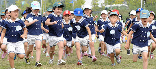 전주 완산구 제1회 유아 건강 마라톤 대회가 24일 삼천에서 열려 효자어린이집 원생들이 청명한 가을 하늘아래서 해맑은 모습으로 달려가고 있다.