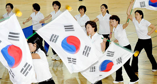 25일 전주화산체육관에서 열린 제12회 전국우리가락 생활체조경연대회에서 진북천변체조회원들이 경연을 펼치고 있다.