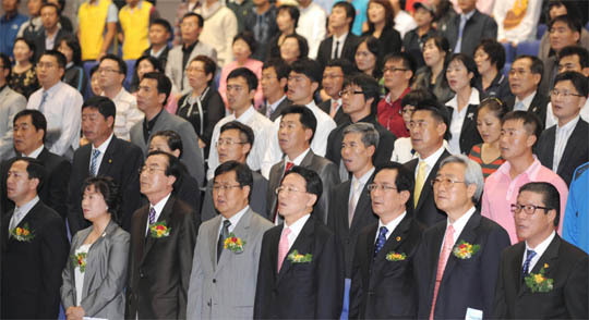 20일 전북도청 대강당에서 열린 장애인체육회 자원봉사 발대식에서 참석자들이 애국가를 부르고 있다.