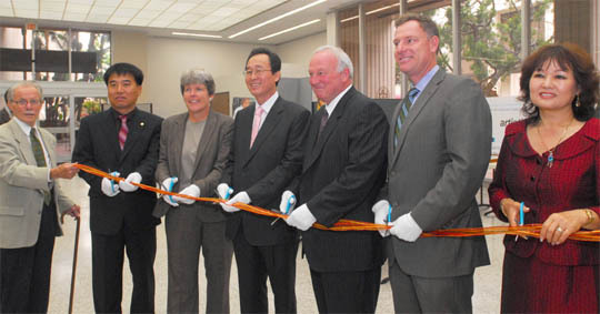 29일 국제 자매도시인 미국 캘리포니아주 샌디에고 시청에서 열린 한지부채 전시회 개막식에서 송하진 전주시장과 김명지 시의원.제리 샌더스 샌디에고 시장 등 참석인사들이 축하 테이프 커팅을 하고 있다.
