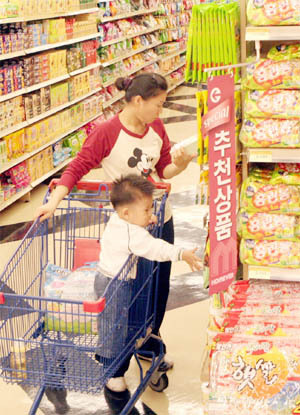 멜라민 공포가 확산되면서 과자류를 찾는 소비자가 줄었다. 5일 전주의 한 대형마트를 찾은 주부가 제품성분과 원산지를 꼼꼼히 살펴보고 있다.