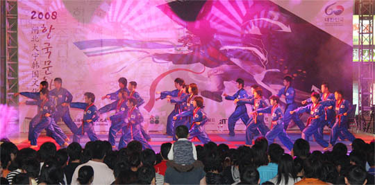 지난 7일까지 중국 상해 따닝 야외무대와 상해체육대학과 홍구 공원 등지에서 태권도 시범을 보인 무주군 학생태권도 시범단.