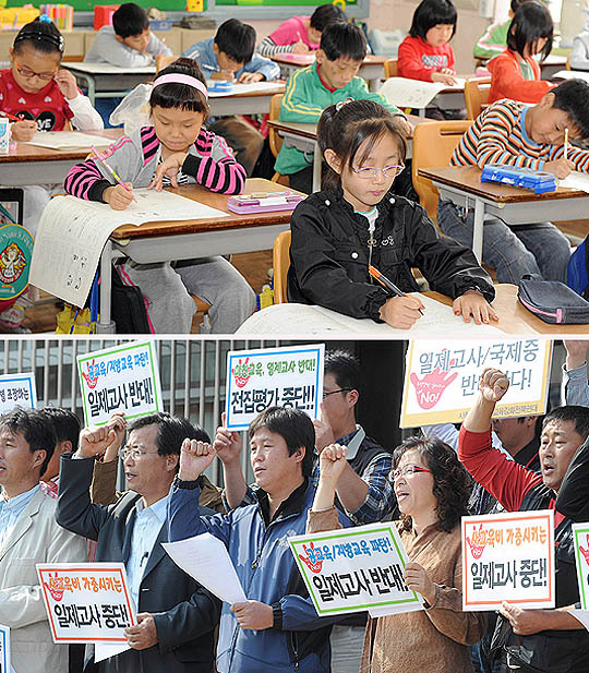 전국 초등학교 3학년 학생들을 대상으로 국가수준 기초학력 진단평가가 실시된 8일 전주 금암초등학교 학생들이 시험 문제를 풀고 있고, 같은 시간 전북도교육청 앞에서 전국일제고사 반대 전북지역 시민사회단체들이 공교육 지방교육 다죽이는 일제고사를 반대한다는 기자회견을 하고 있다.