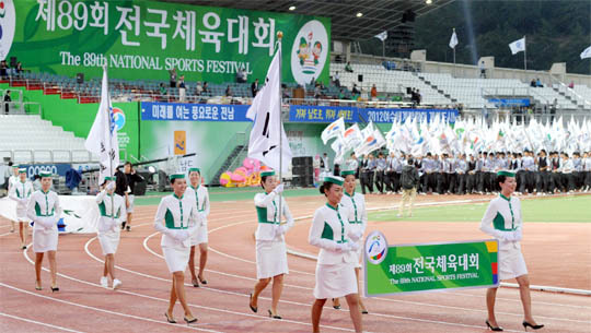 제89회 전국체육대회을 하루 앞둔 9일 전남 여수 진남경기장에서 선수단들이 입장을 하고 있다.