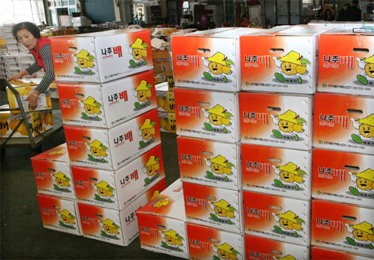 풍작으로 과일값이 한달 전에 비해 절반 가까이 폭락했다. 10일 전주농산물도매시장에 경매를 기다리는 배가 잔뜩 쌓여있다.