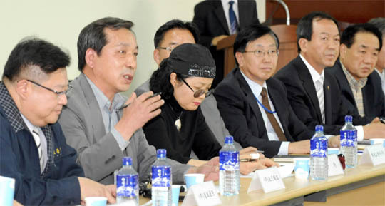 13일 익산 세관 사무실에서 열린 환율급등 원자재가 상승 대응방향 모색을 위한 중소무역업체 간담회에서 중소기업 대표자들이 김완주지사에게 건의사항을 말하고 있다.