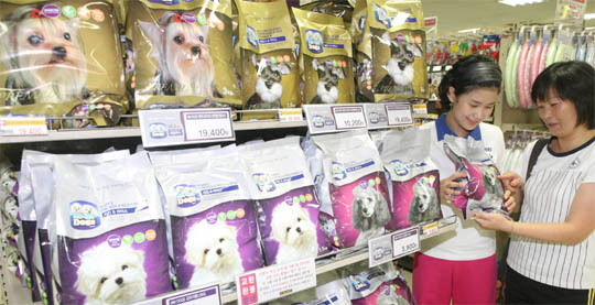 신세계 이마트에서 개와 고양이 등 애완 동물을 위한 자체브랜드(PL)상품인 '엠엠독스(m.m Dogs)'와 '엠엠캣츠(m.m Cats)'를 선보인 가운데 16일 이마트 전주점을 찾은 고객들이 강아지용 사료를 고르고 있다.