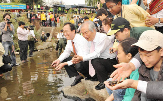 16일 '리틀 람사르 전주 아시아청소년 환경캠프 창립대회' 개막식에 앞서 송하진 전주시장과 김남곤 전북일보 사장을 비롯한 참석자들이 조개를 전주천에 방사하고 있다.
