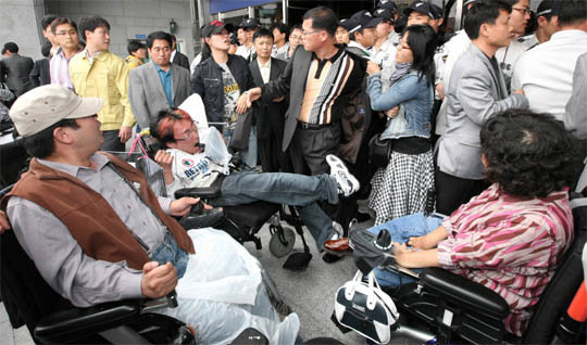 23일 전북 장애인 단체 회원들이 전주시청에서 교통약자 이동권 확보 촉구를 위한 집회를 갖고 전주시장과의 면담을 요구하며 시청에 진입하려 하자 직원들이 막아 서고 있다.